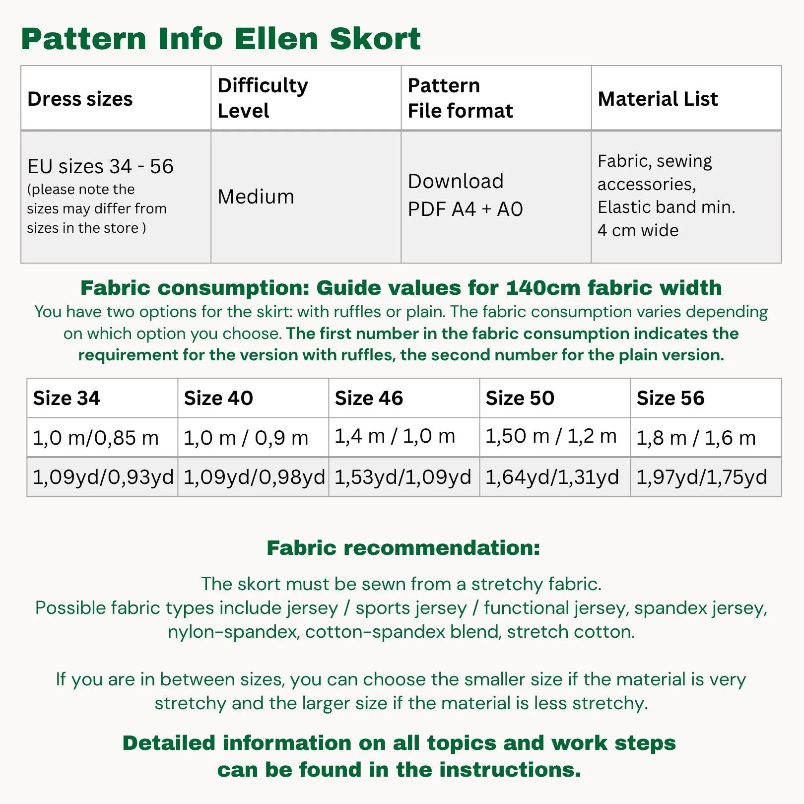 Here you can get our exclusive Ellen Skort / Culottes pattern. It will be sent digitally along with very detailed and illustrated instructions. The instructions describe each sewing step in detail and include additional general sewing tips and further tips on how to adapt the pattern to your needs.