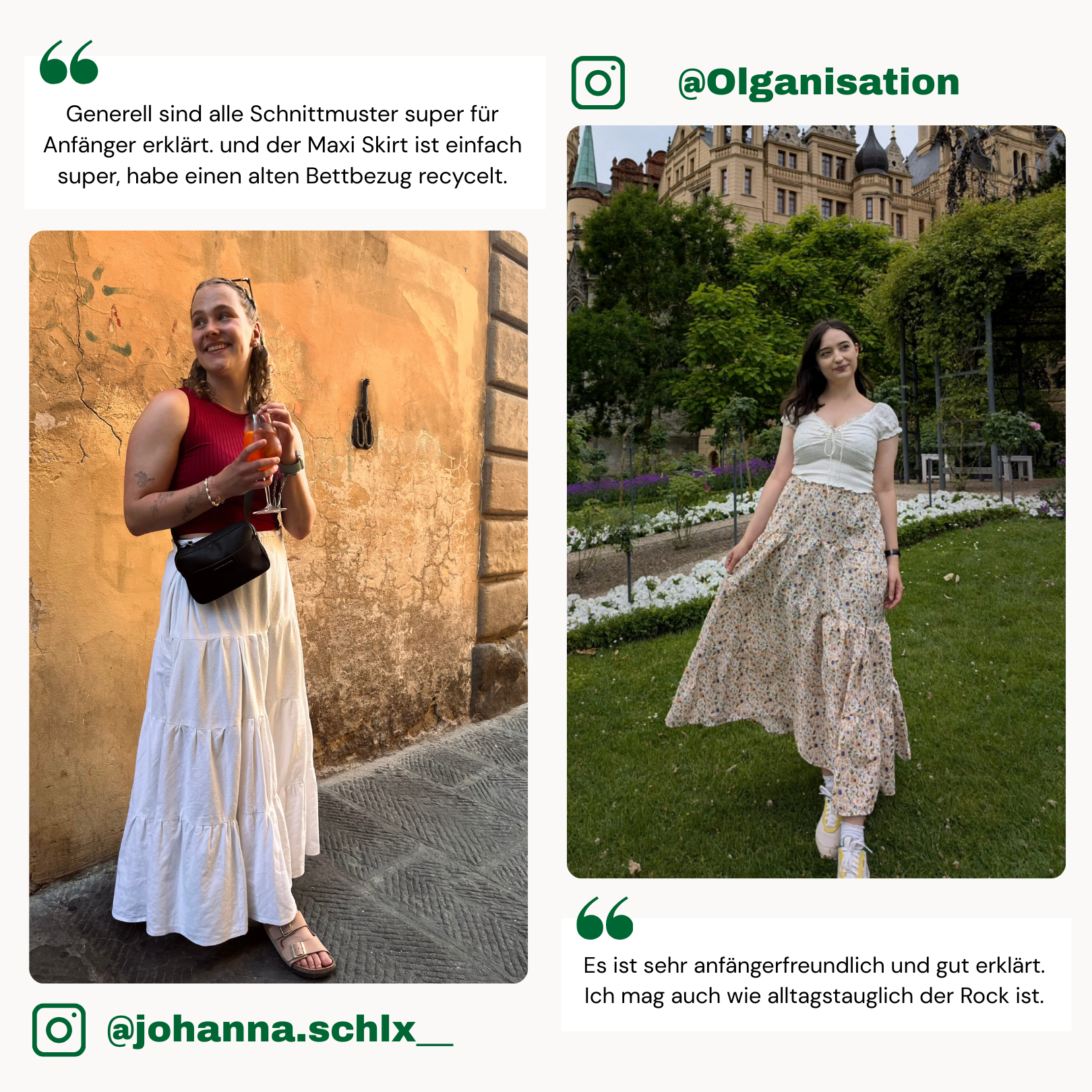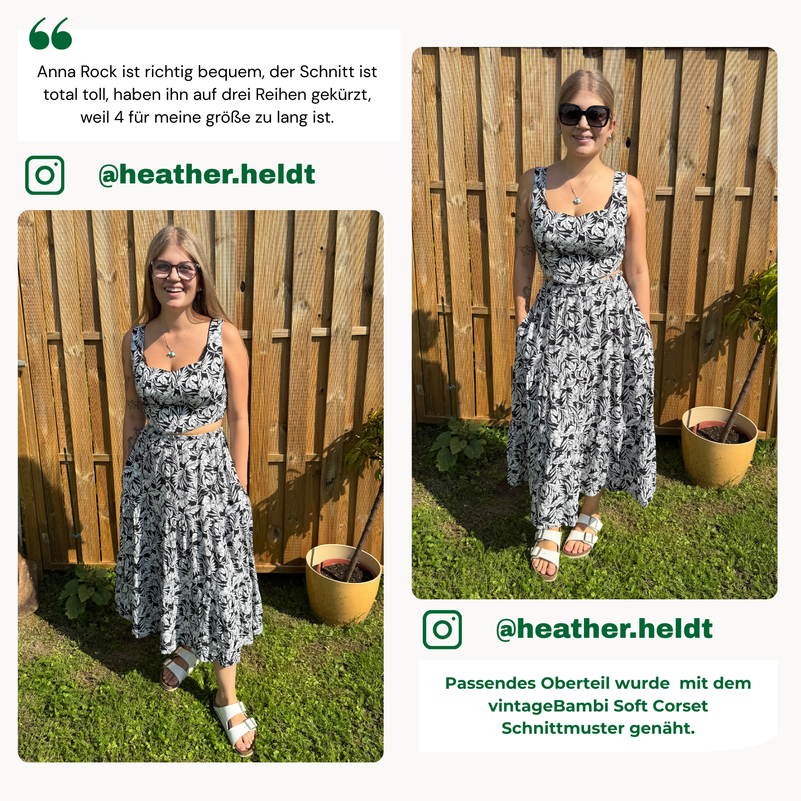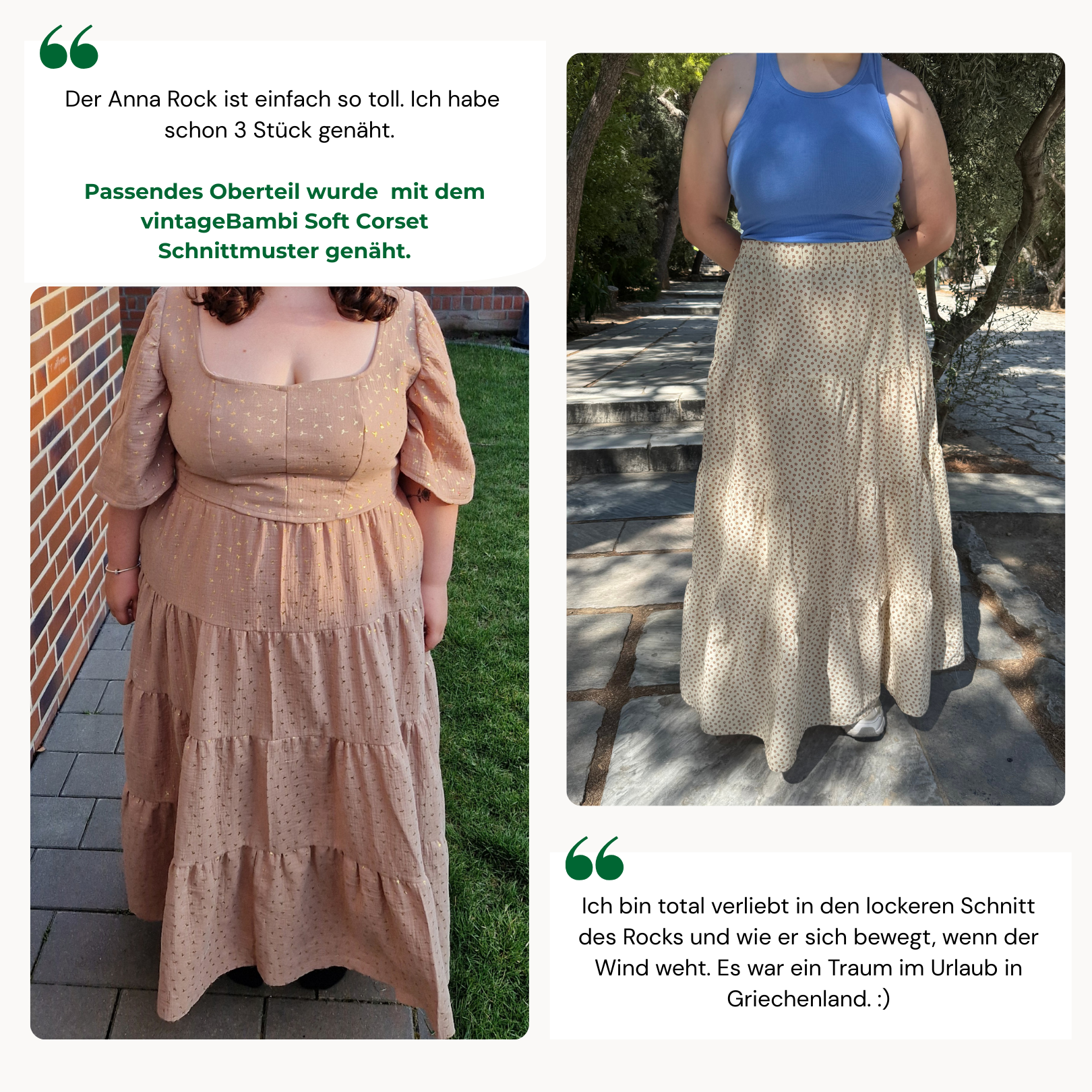 Hier bekommst du unser exklusives Anna Maxirock Schnittmuster. Es wird mit einer sehr ausführlichen und bildlichen Anleitung zusammen digital versendet. Die Anleitung beschreibt ausführlich jeden Näh-Schritt und enthält zusätzliche allgemeine Näh-Tipps und weitere Tipps wie du das Schnittmuster an deine Wünsche anpassen kannst.