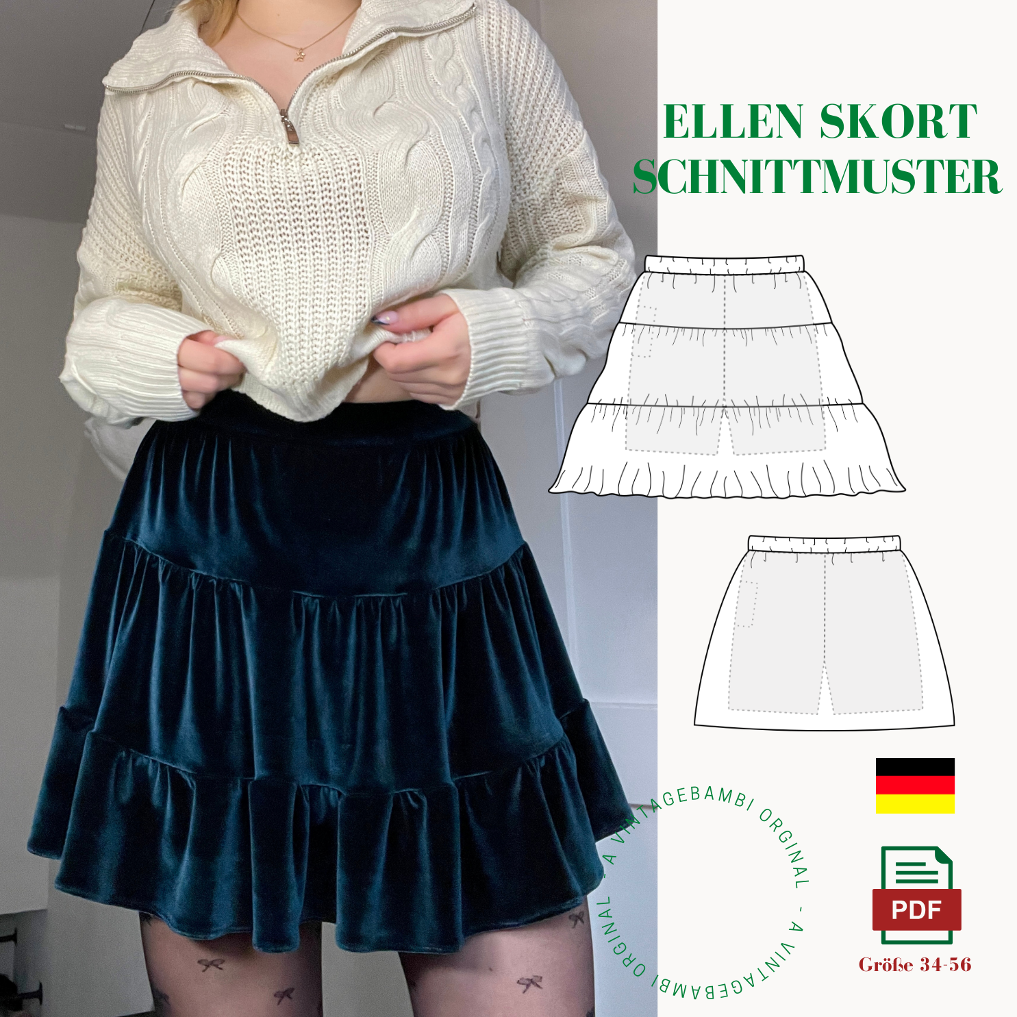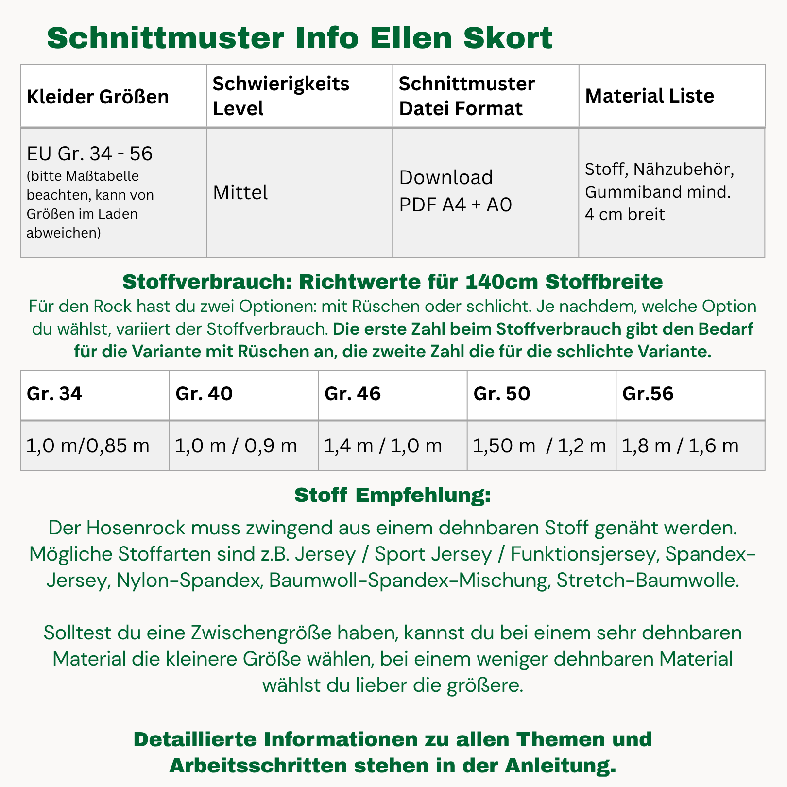 Hier bekommst du unser exklusives Ellen Skort / Hosenrock Schnittmuster. Es wird mit einer sehr ausführlichen und bildlichen Anleitung zusammen digital versendet. Die Anleitung beschreibt ausführlich jeden Näh-Schritt und enthält zusätzliche allgemeine Näh-Tipps und weitere Tipps wie du das Schnittmuster an deine Wünsche anpassen kannst.