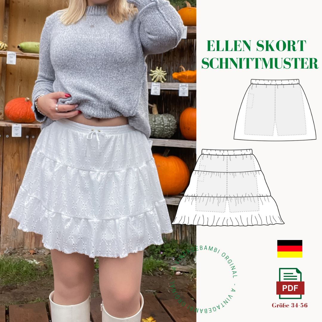 Der Ellen Rock mit integrierter Leggings kombiniert ein süßes Design mit echter Alltagstauglichkeit. Der Rock kann entweder schlicht und glatt oder in einer verspielten Version mit Rüschen-Bahnen genäht werden – beide Varianten sind charmant und bieten dir die Freiheit, den Stil nach deinem Geschmack anzupassen. Die Leggings darunter sorgt für Komfort und Beweglichkeit, und die zusätzlichen Taschen sind ideal für kleine Essentials. Ein vielseitiges Schnittmuster, das Praktisches mit Stil verbindet – perfekt für aktive Tage mit einem modischen Touch!