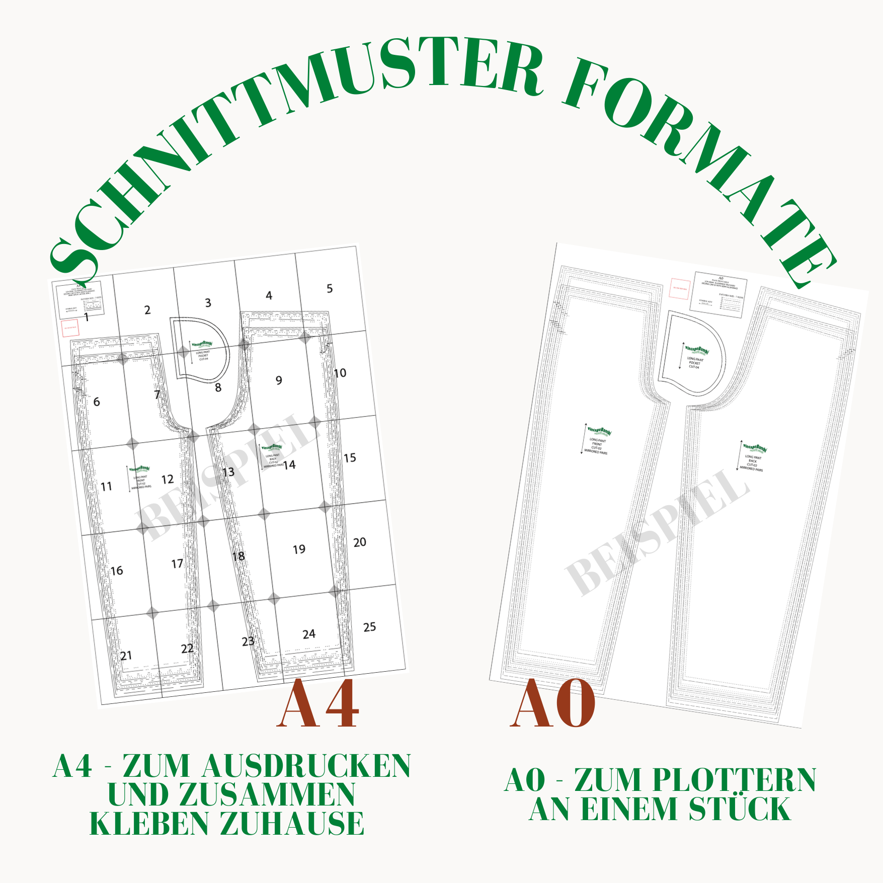 Das digitale Schnittmuster kann sofort heruntergeladen werden und wird nicht physisch versendet. Es ist im A4-Format und im A0- Format verfügbar und kann entweder in A4 zu Hause ausgedruckt werden, oder in A0 an einem Plotter (zb im Copyshop).