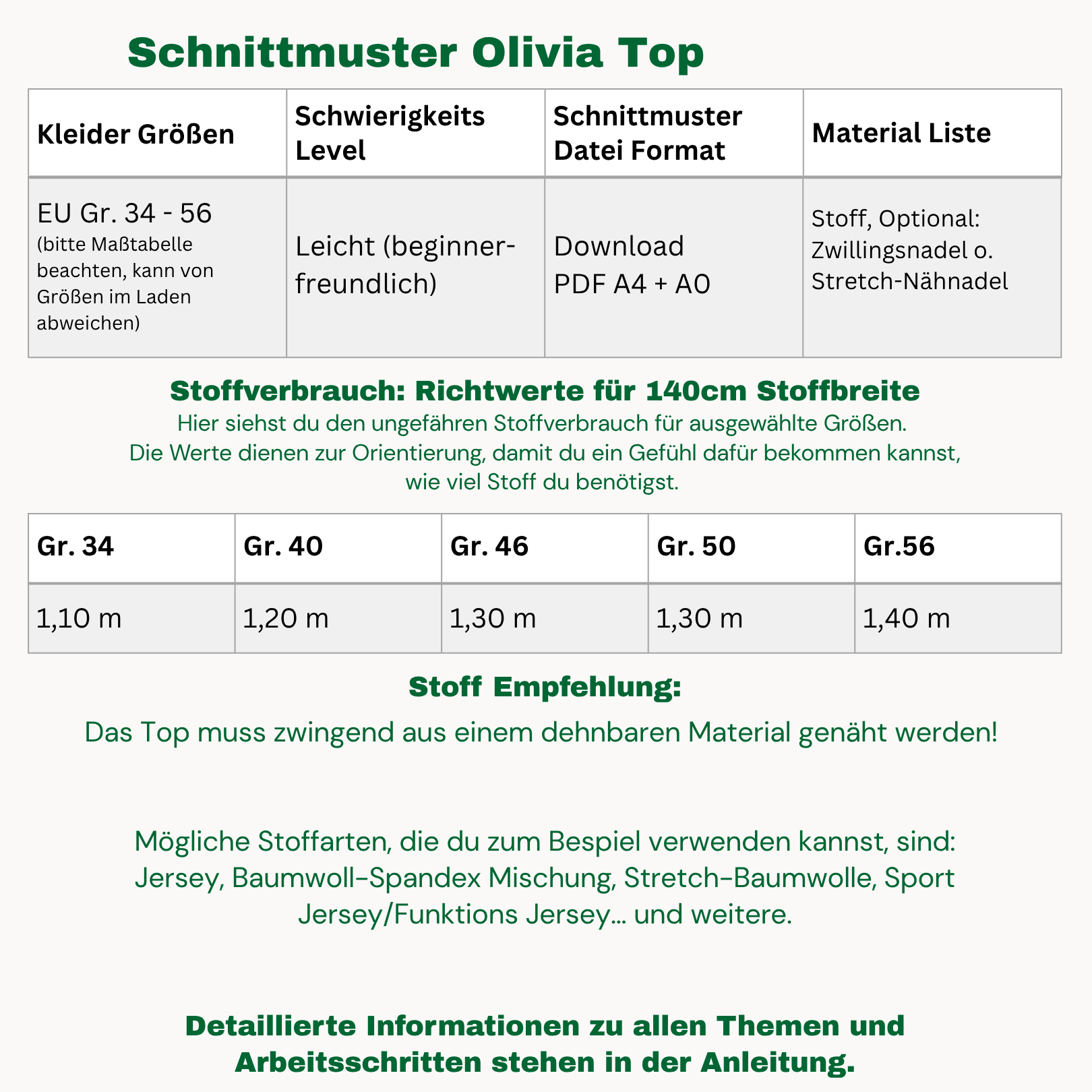 Hier bekommst du unser exklusives Olivia Top Schnittmuster. Es wird mit einer ausführlichen und bildlichen Anleitung geliefert.