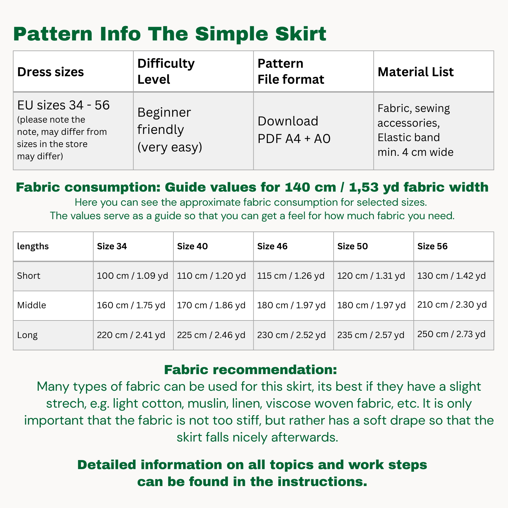 Here you can get our exclusive "The simple skirt" pattern. It will be sent digitally along with very detailed and illustrated instructions. The instructions describe each sewing step in detail and include additional general sewing tips and further tips on how to adapt the pattern to your needs.