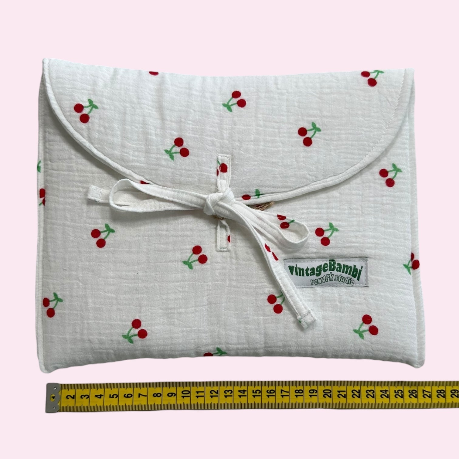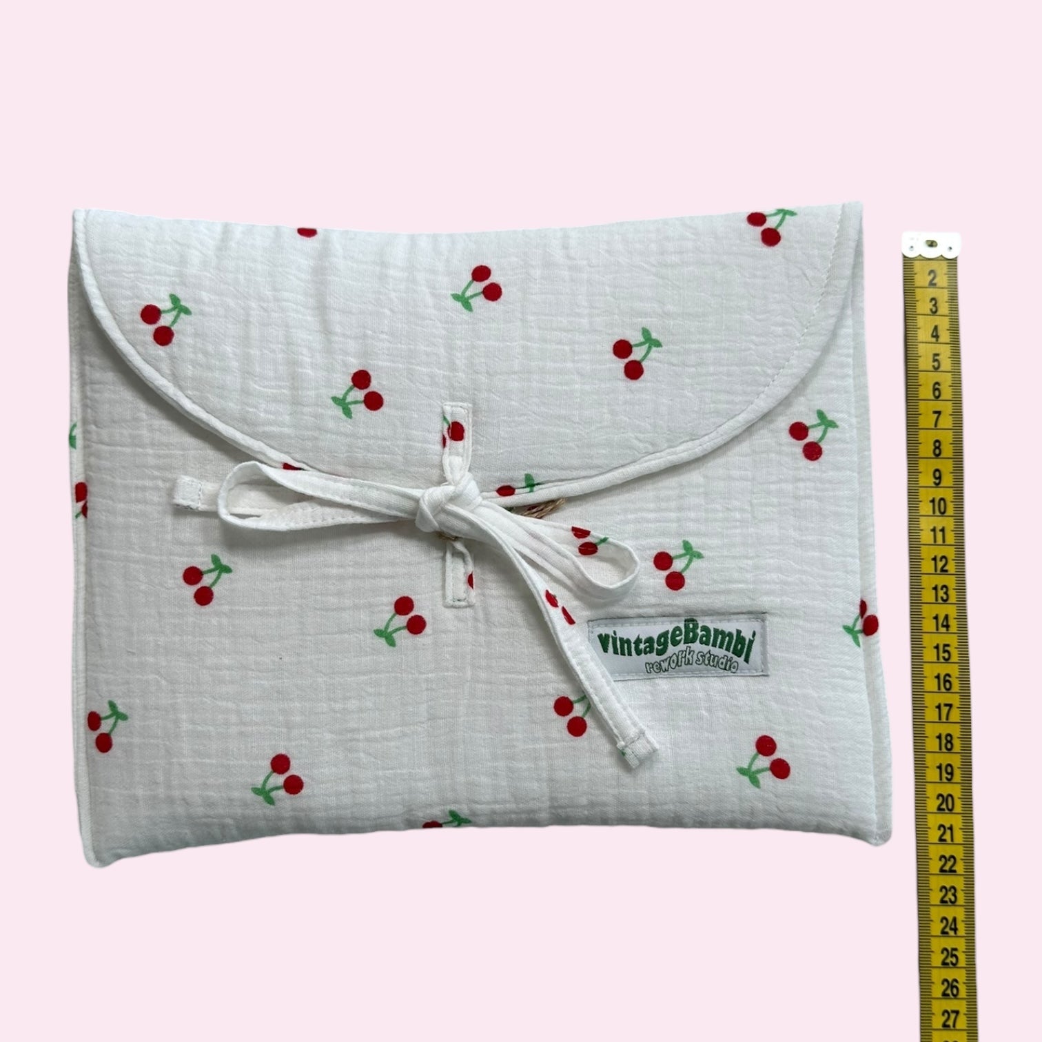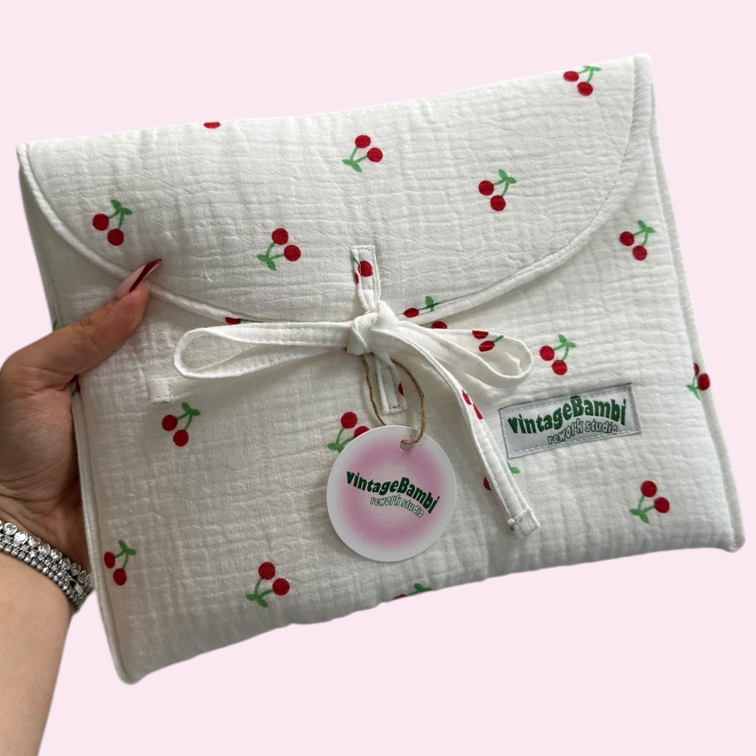 Süße iPad Hüllen aus Kirschen Stoff und einer Schleife als Verschluss.