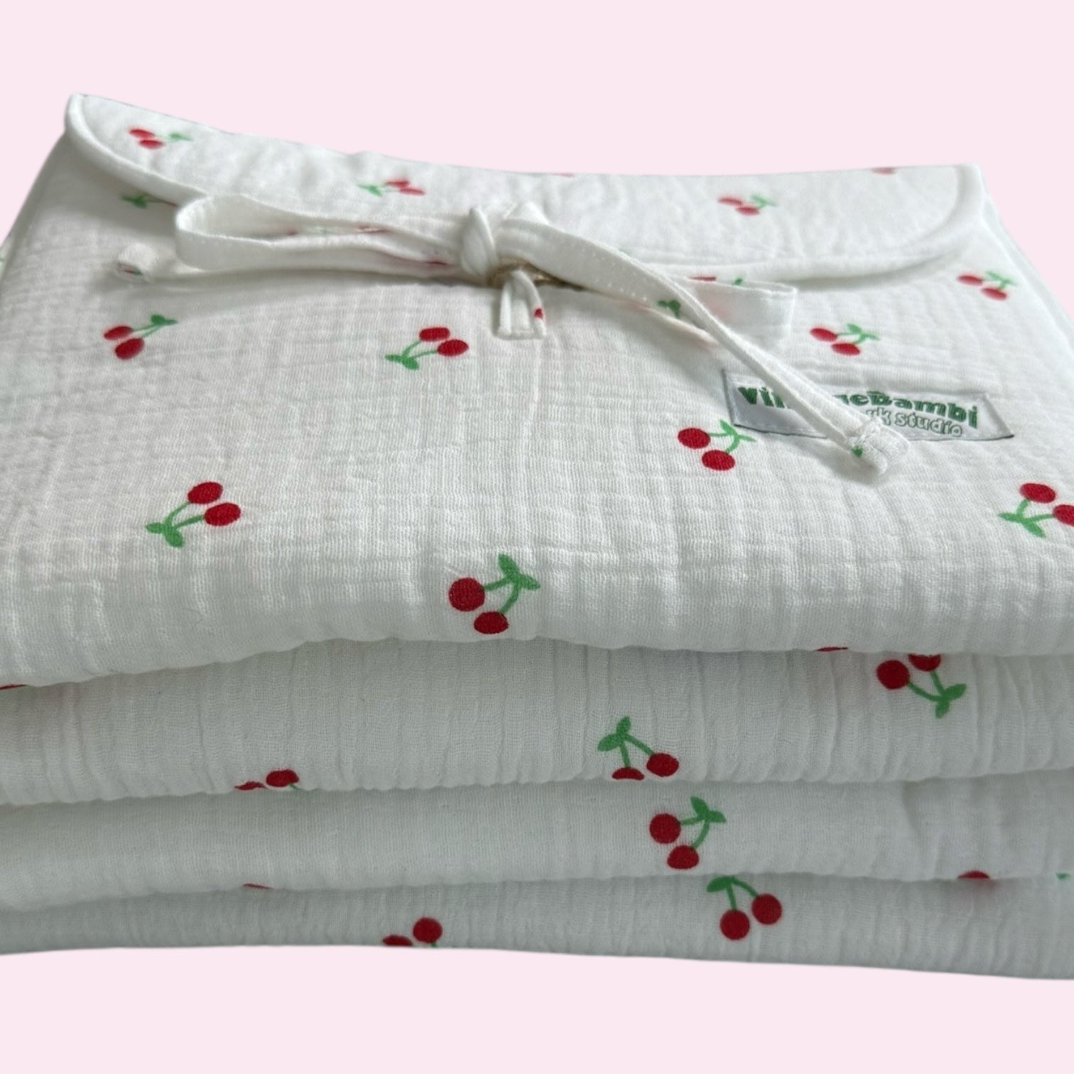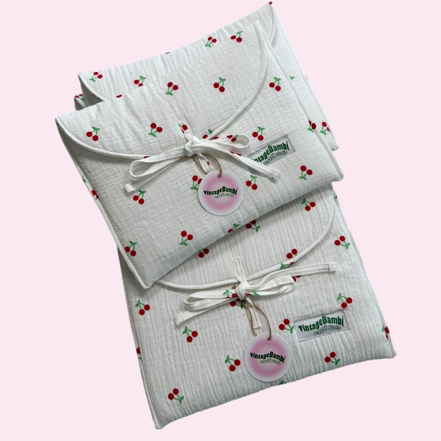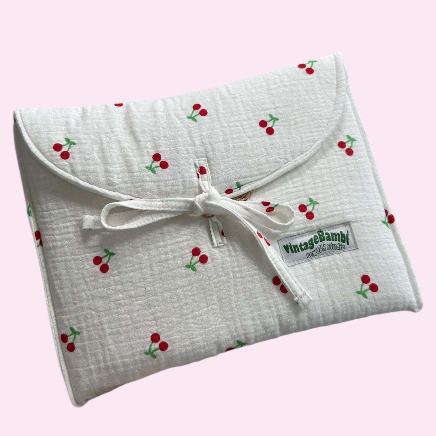 Süße iPad Hüllen aus Kirschen Stoff und einer Schleife als Verschluss.