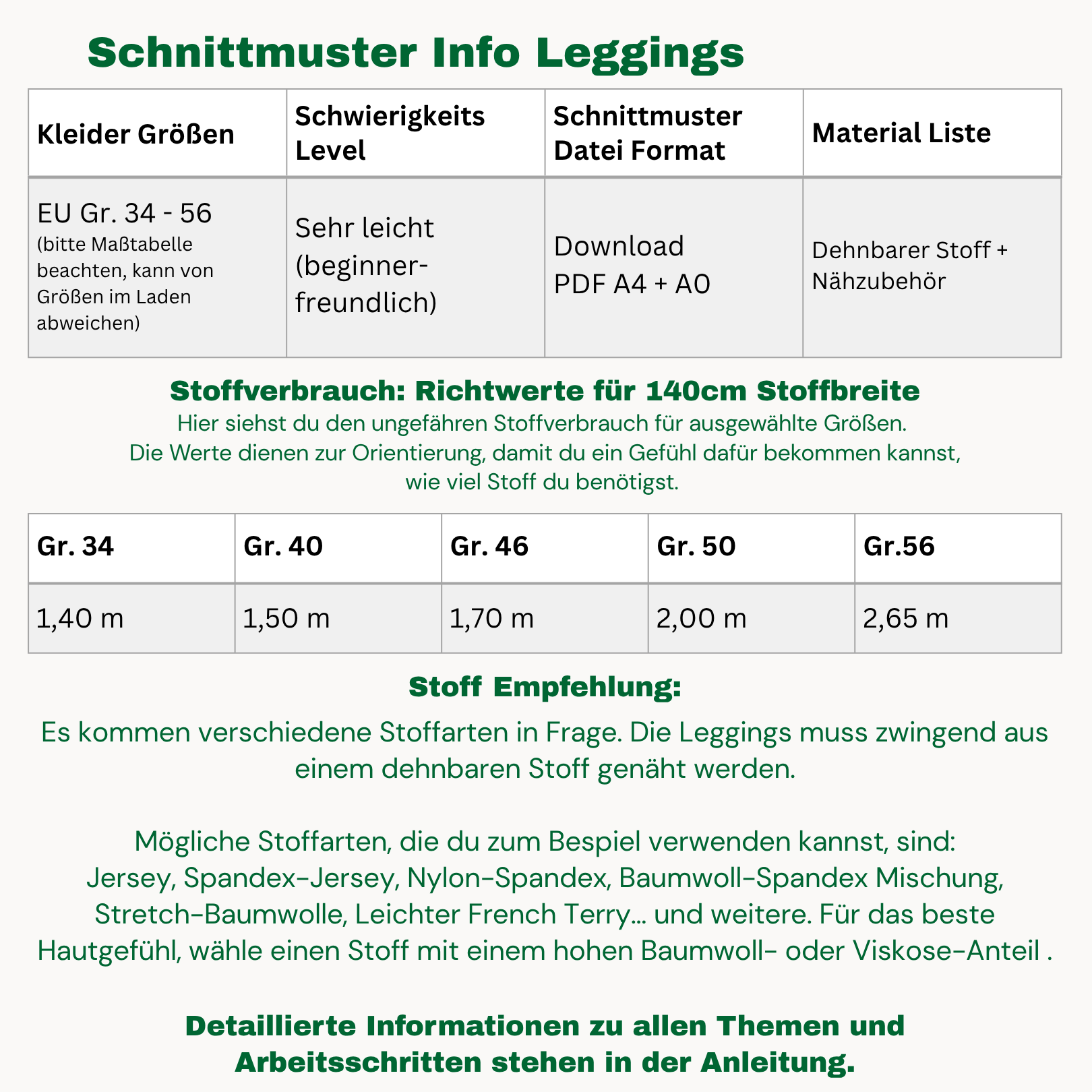 Hier bekommst du unser exklusives Leggings Schnittmuster. Es wird mit einer sehr ausführlichen und bildlichen Anleitung zusammen digital versendet. Die Anleitung hilft dir, das Kleidungsstück zu nähen und es auf deinen Körper anzupassen.