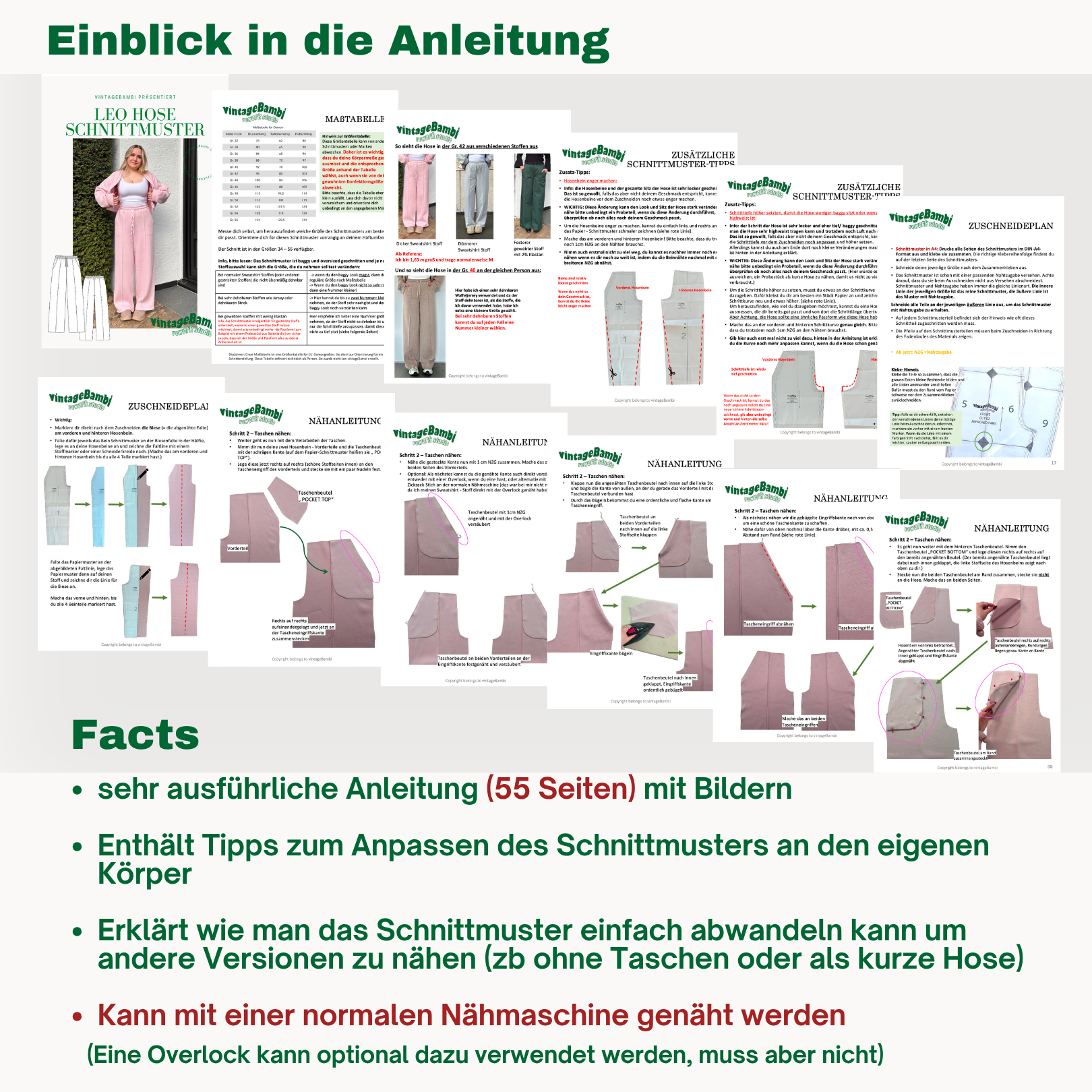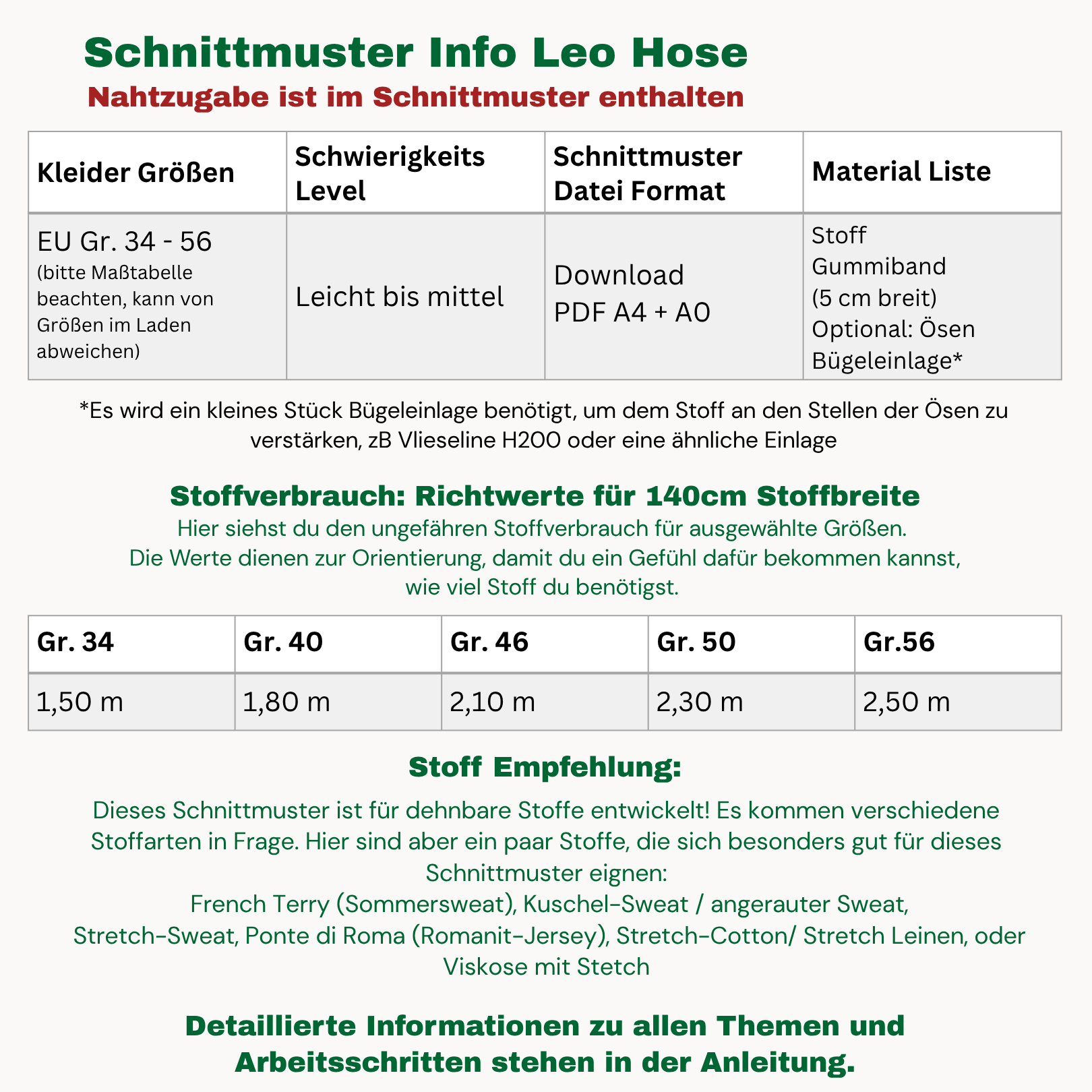 Hier bekommst du unser exklusives Leo Hose Schnittmuster. Es wird mit einer sehr ausführlichen und bildlichen Anleitung zusammen digital versendet. Die Anleitung hilft dir, das Kleidungsstück zu nähen und auf deinen Körper anzupassen.