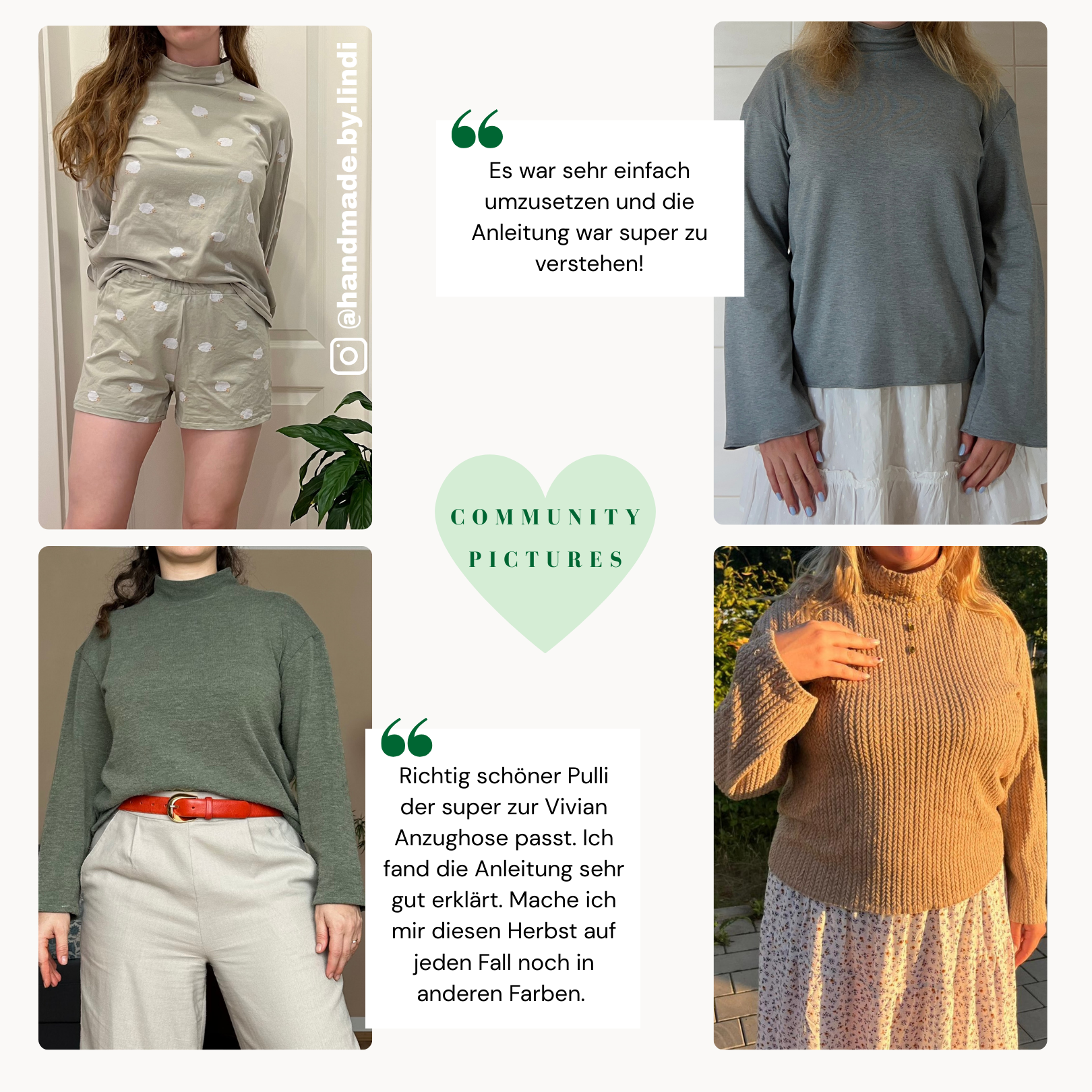 Hier bekommst du unser exklusives Longsleeve Rollkragen Pullover Schnittmuster. Es wird mit einer ausführlichen und bildlichen Anleitung geliefert, die dir hilft, das Kleidungsstück zu nähen.