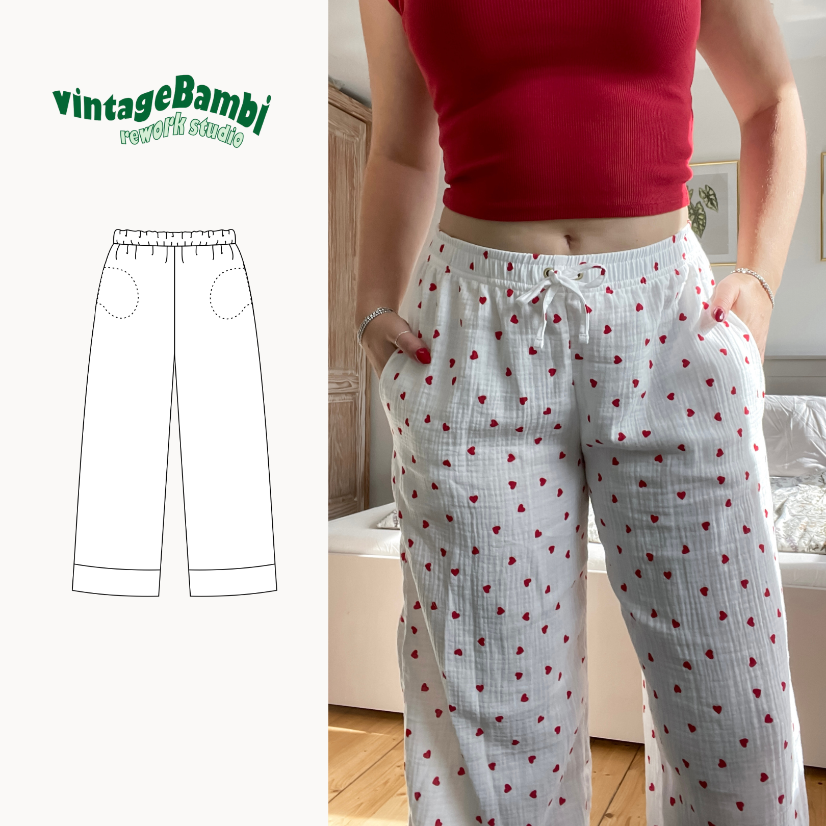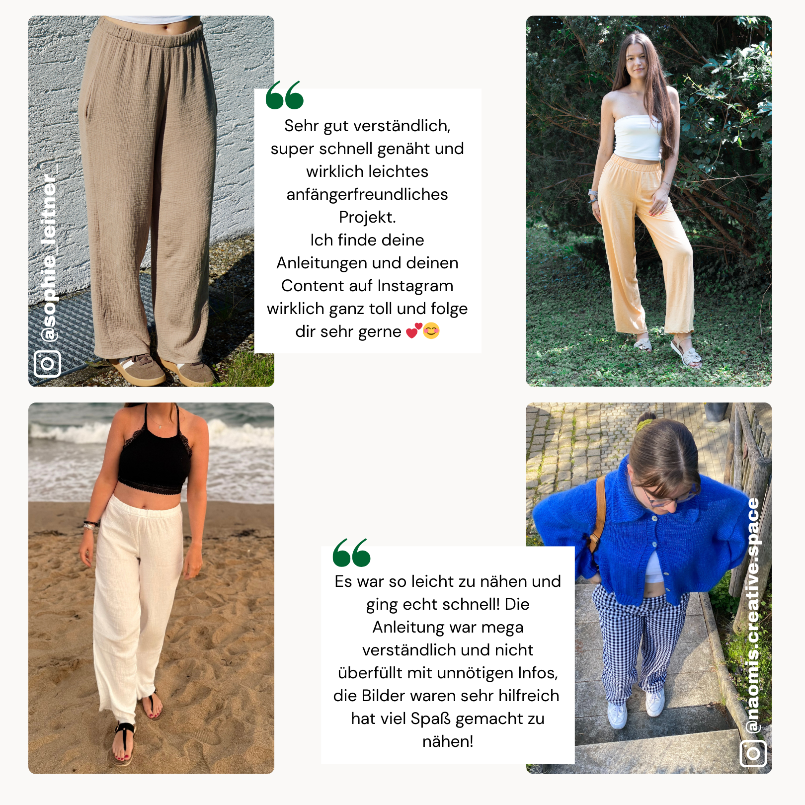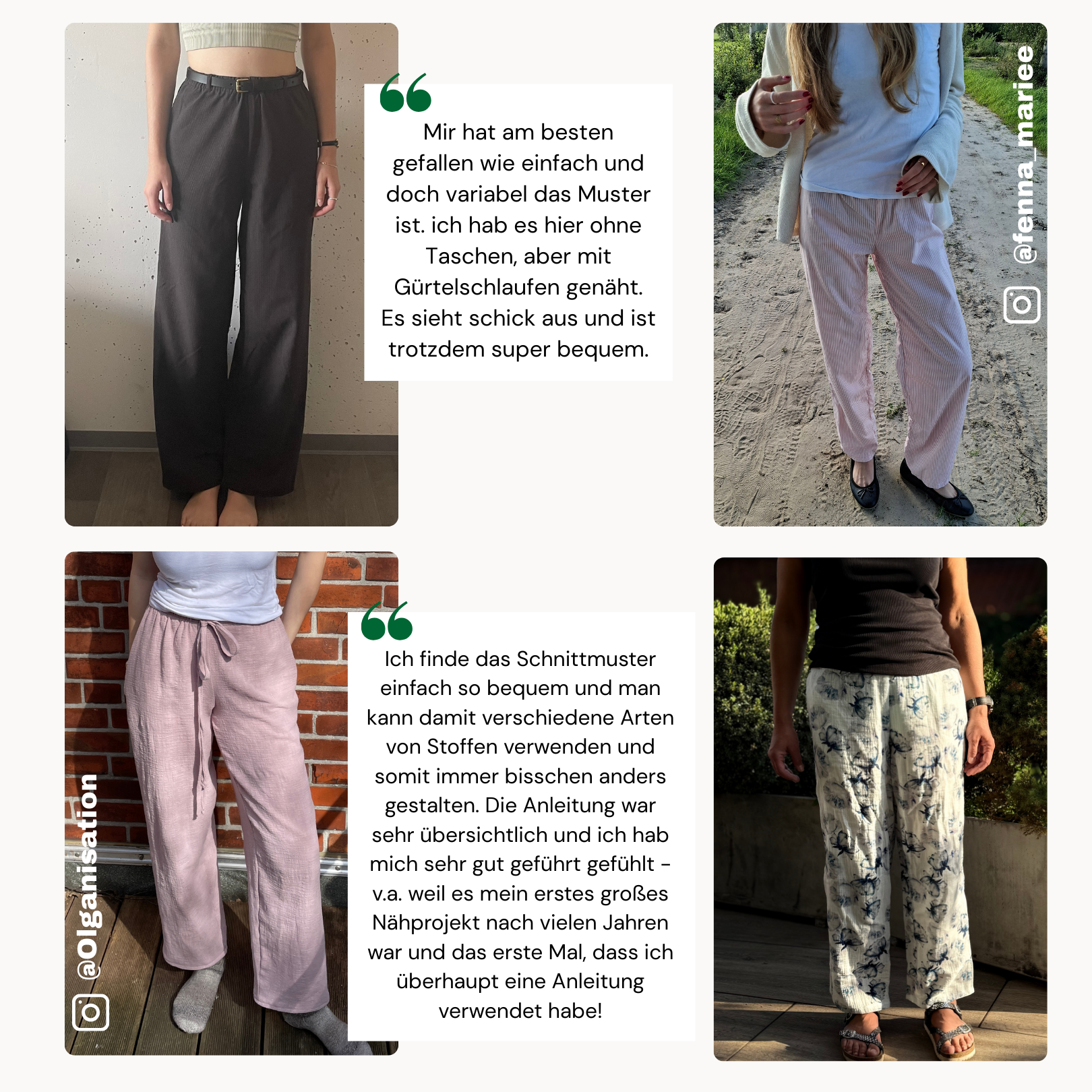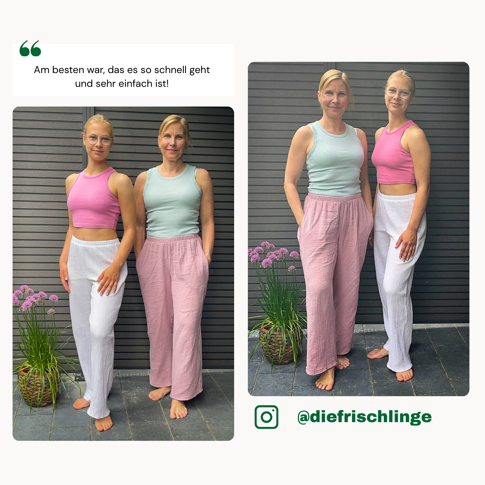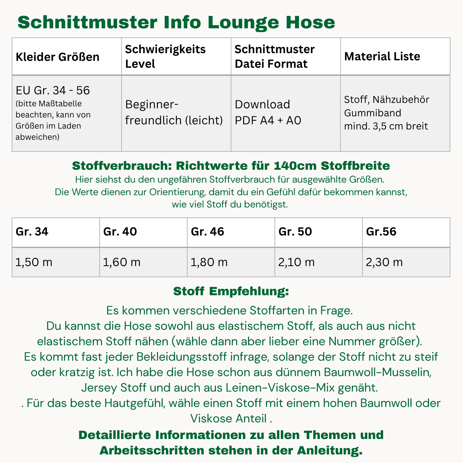 Hier bekommst du unser exklusives Lounge Hose Schnittmuster. Es wird mit einer sehr ausführlichen und bildlichen Anleitung zusammen digital versendet. Die Anleitung hilft dir, das Kleidungsstück zu nähen.