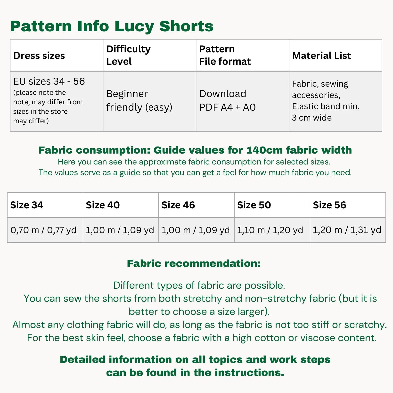 The Lucy shorts are the perfect companion for relaxed days. With their loose cut and comfortable elastic waistband, they offer comfort and still look cute. They are very easy to sew and can be customized with a flexible choice of fabrics, from more elegant shorts for the evening to cozy shorts for the couch or for sleeping.