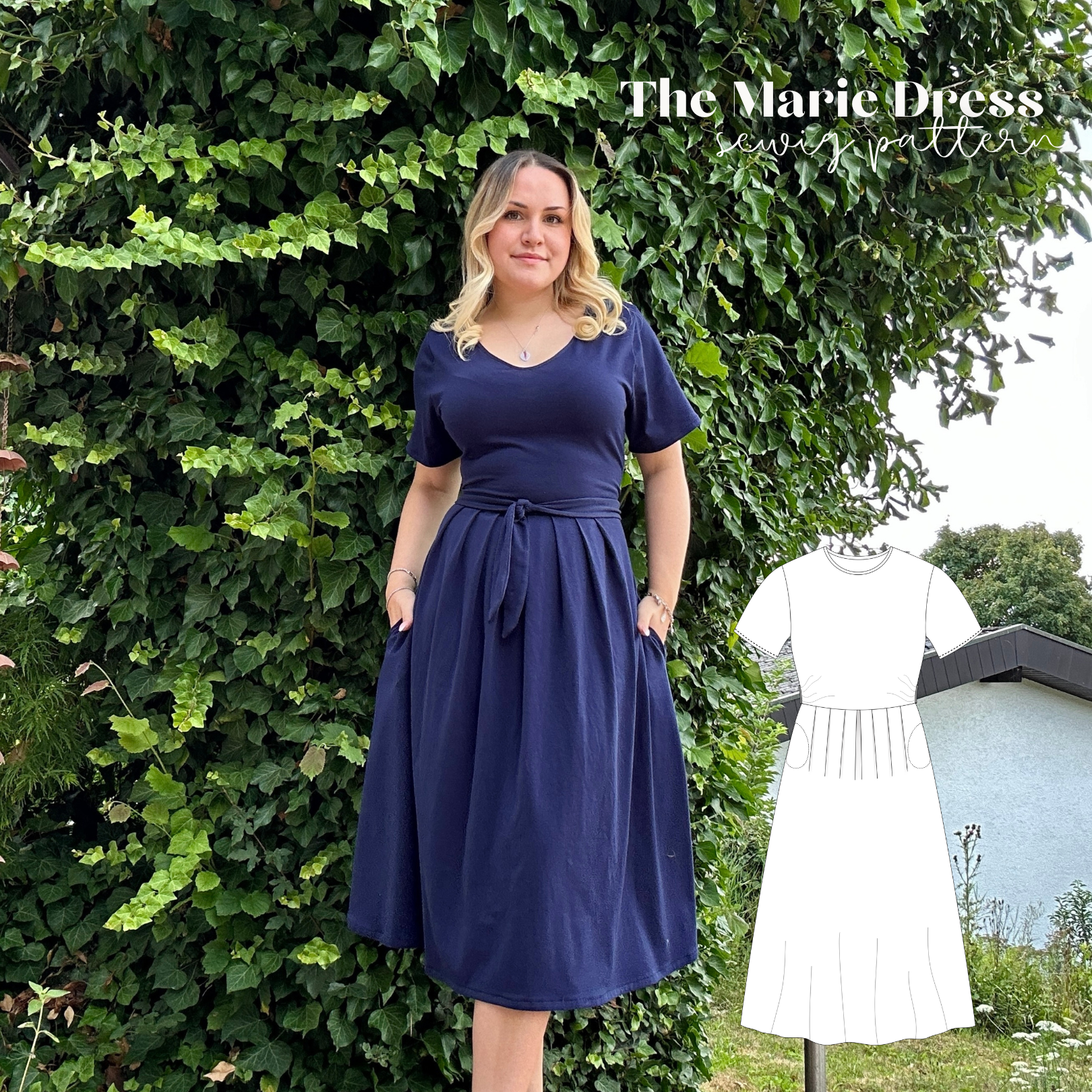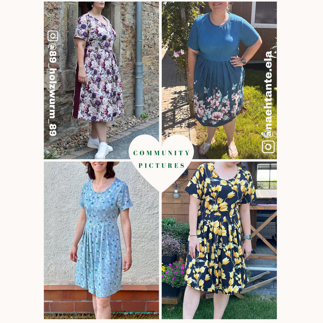 Das Marie Kleid ist ein wunderbarer Mix aus lässigem Komfort und zeitloser Eleganz, perfekt für alle, die es bequem, aber stilvoll mögen. Das Oberteil hat einen lockeren T-Shirt-Schnitt, den du wahlweise mit Rundhals oder V-Ausschnitt nähen kannst. Der Rockteil ist vorne mit gelegten Falten gestaltet, hinten fällt er glatt – für eine klare Linie ohne störende Nähte. Seitliche Taschen sorgen für Alltagstauglichkeit, und die Bindebänder in der Taille lassen sich im Rücken oder überkreuzt vorn binden, damit du die Weite ganz individuell anpassen kannst.