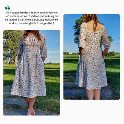 Je nach Stoff wirkt das Kleid romantisch und verspielt oder edel und festlich; perfekt für besondere Anlässe, Sommerfeste oder einfach, wenn du dich besonders schön fühlen möchtest. Und weil das Kleid ohne Reißverschluss auskommt, ist es trotz seiner eleganten Wirkung anfängerfreundlich und gut zu nähen.