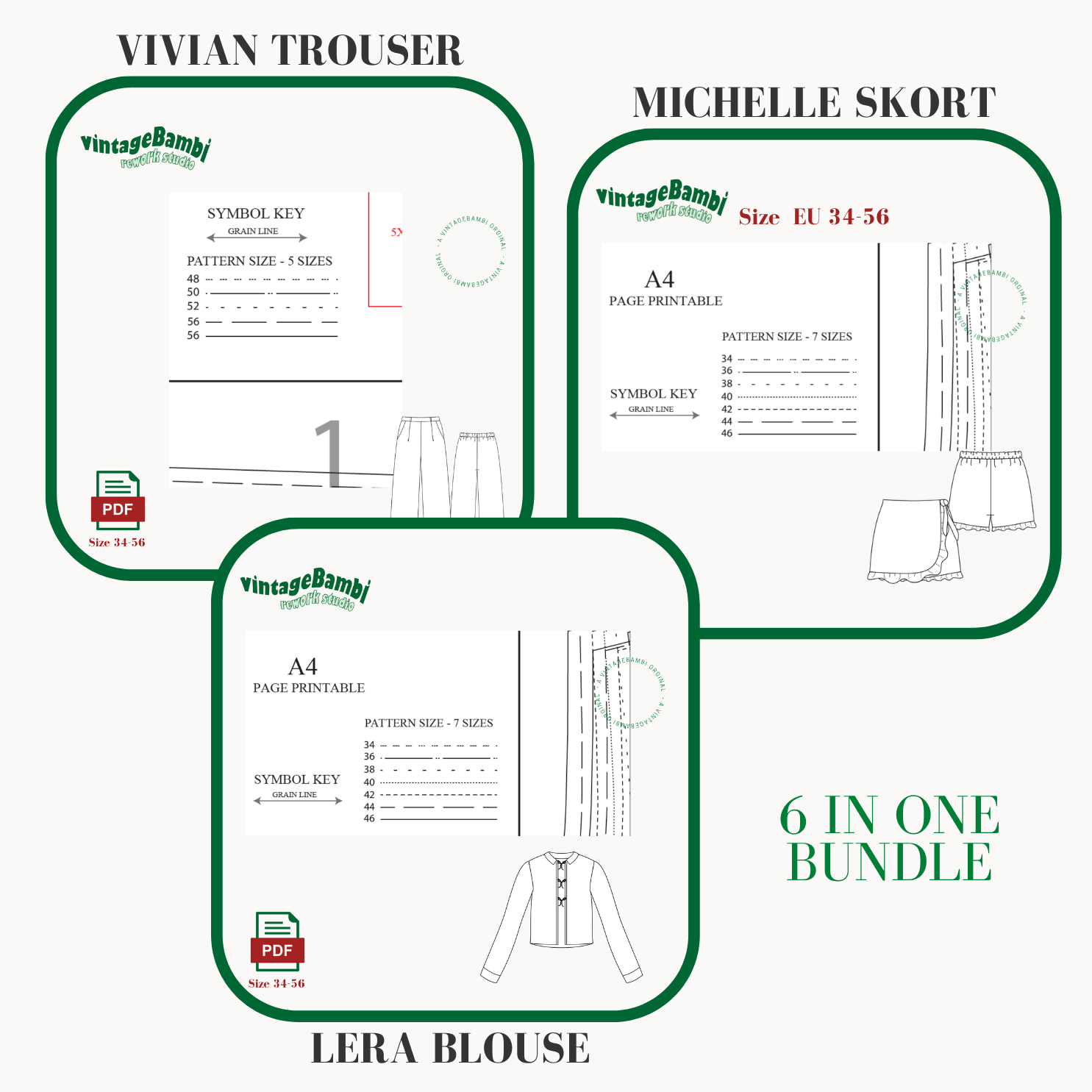 Included are the Lounge Pants pattern, the elegant Vivian Trousers pattern, the cute Michelle skort pattern, the Leggings pattern with a fold-over waistband, the super versatile Shirt/Dress pattern, and the Lera Blouse pattern.