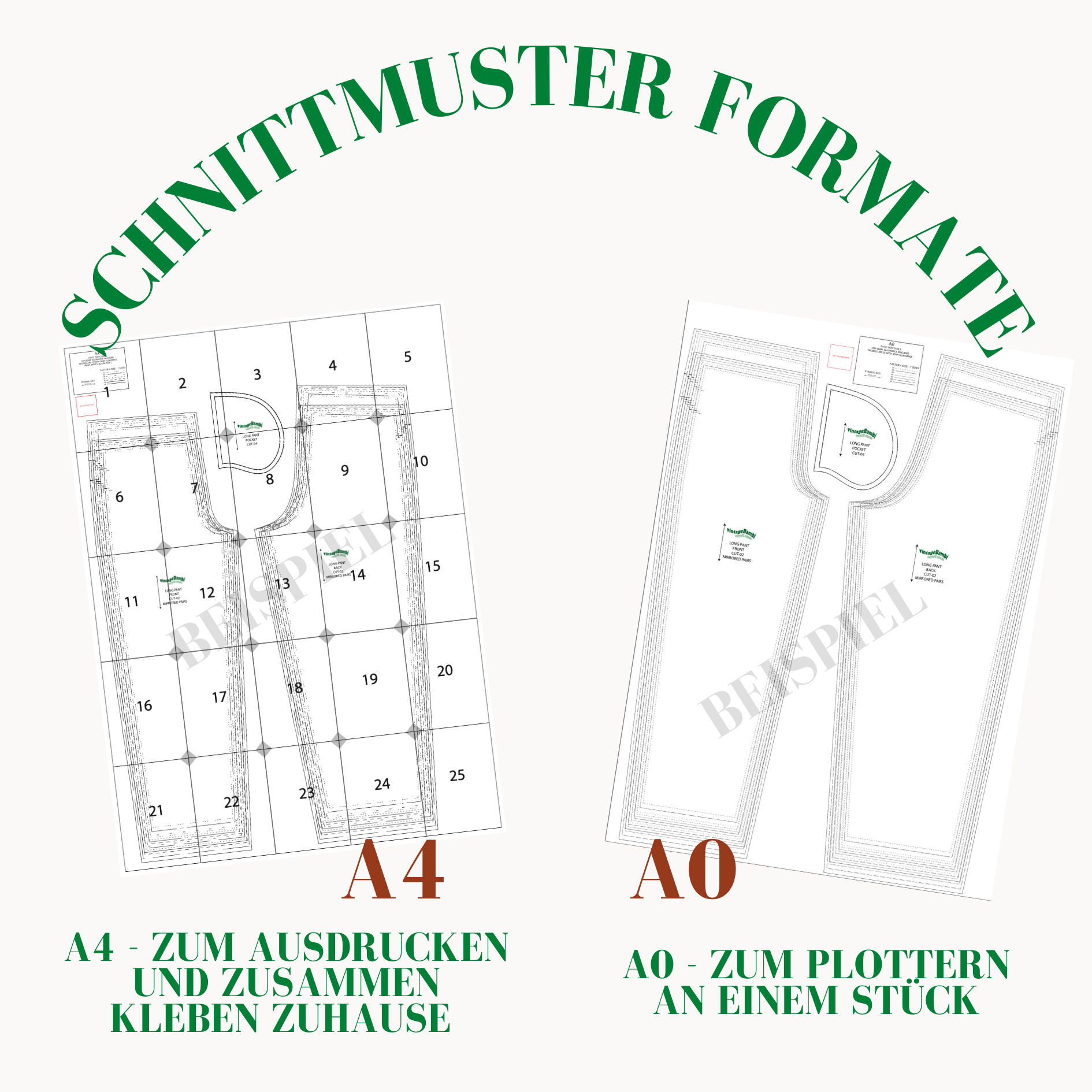 Das digitale Schnittmuster kann sofort heruntergeladen werden und wird nicht physisch versendet. Es ist im A4-Format und im A0- Format verfügbar und kann entweder in A4 zu Hause ausgedruckt werden, oder in A0 an einem Plotter (zb im Copyshop).