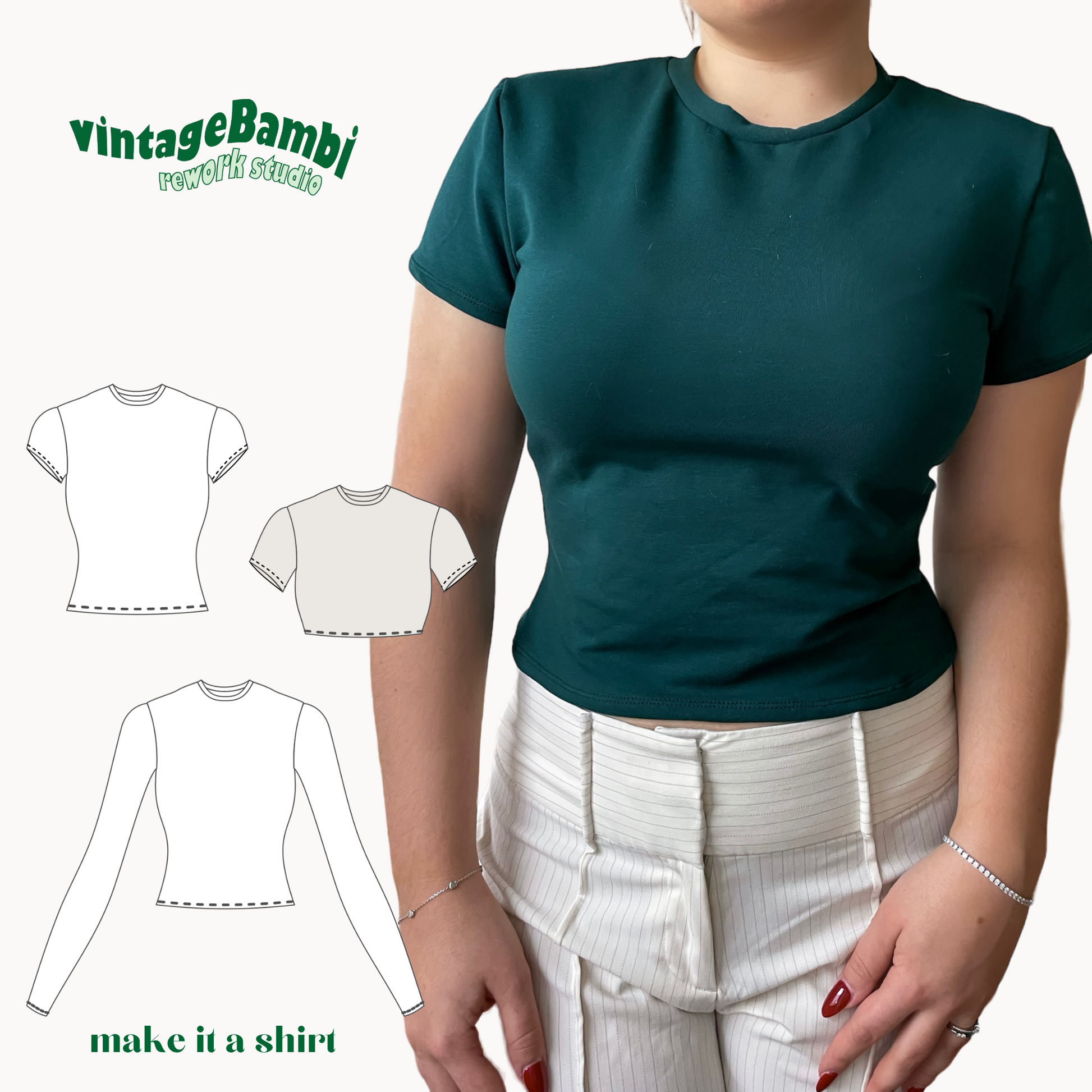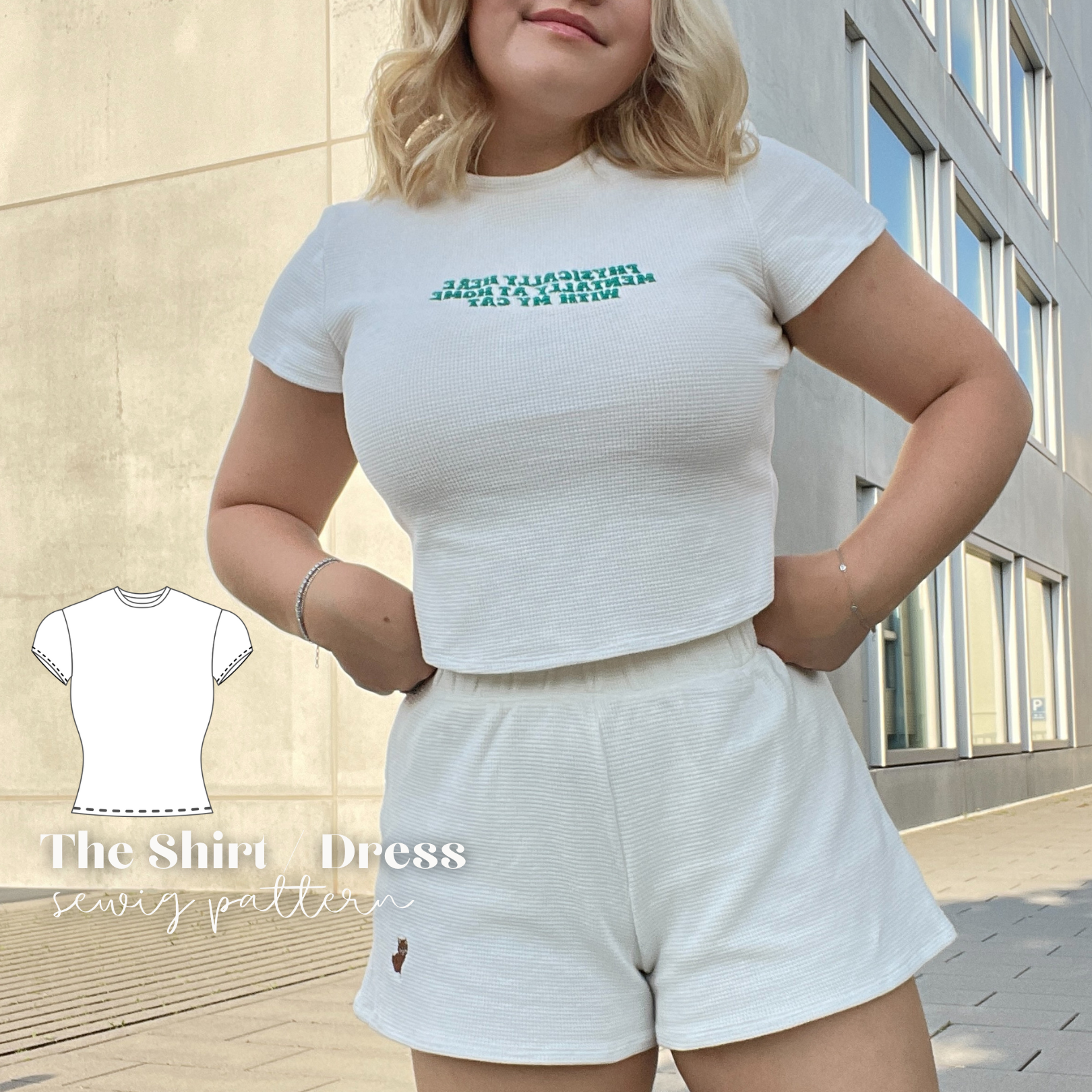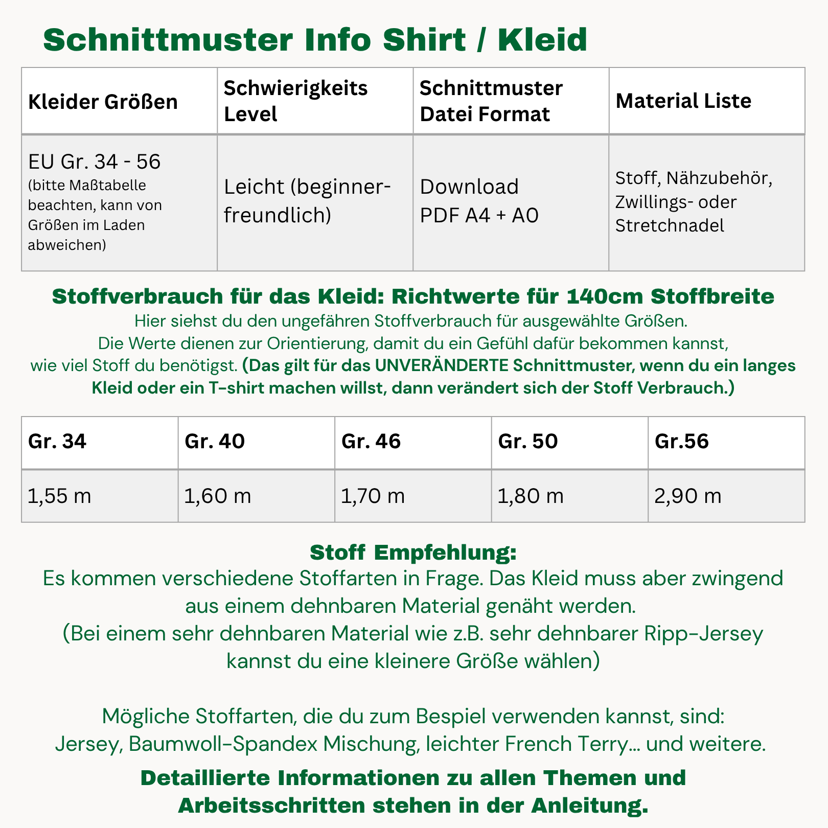 Hier bekommst du unser exklusives T-Shirt / Kleid Schnittmuster. Es wird mit einer ausführlichen und bildlichen Anleitung geliefert, die dir hilft, das Kleidungsstück zu nähen und Schnittmuster an deinen Körper anzupassen.