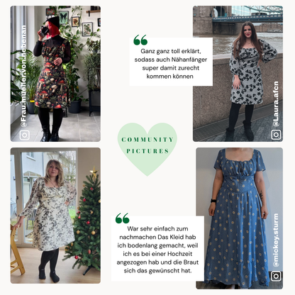 Dieses Kleid kombiniert die Leichtigkeit eines Sommerkleides mit der Eleganz eines Korsetts. Die gerafften Puffärmel und der Korsettgürtel zaubern eine figurbetonte Taille, während die Schnürung hinten für eine perfekte Passform sorgt. Einfach zu nähen dank der detaillierten Anleitung, ist es ein vielseitiges und stilvolles Kleidungsstück für warme und kältere Tage. Mit deiner Stoffauswahl kannst du selber entscheiden für welche Jahreszeit und Anlass du das Kleid gestalten willst.